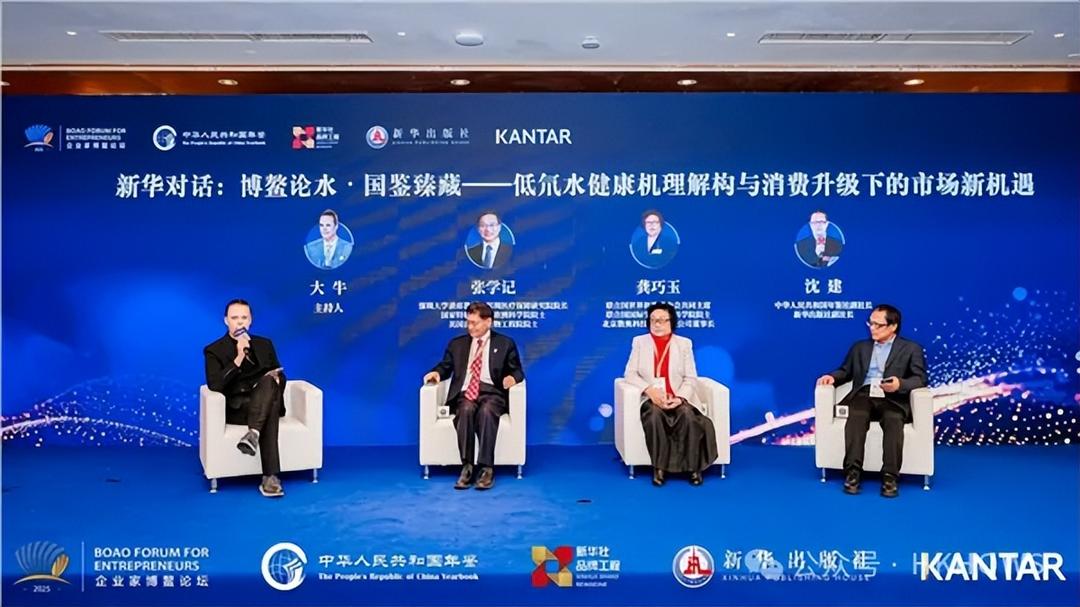 在重磅环节“新华对话”中,龚巧玉院士与深圳大学讲席教授、欧洲科学院院士张学记,以及中华人民共和国年鉴社副社长、新华出版社副社长沈建,以“博鳌论水·国鉴臻藏——低氘水健康机理解构与消费升级下的市场新机遇”为主题展开深入交流。三位嘉宾从科学认知、品牌建设、市场趋势等多维度切入,为饮用水产业的价值创新与未来路径提供了前瞻洞察。