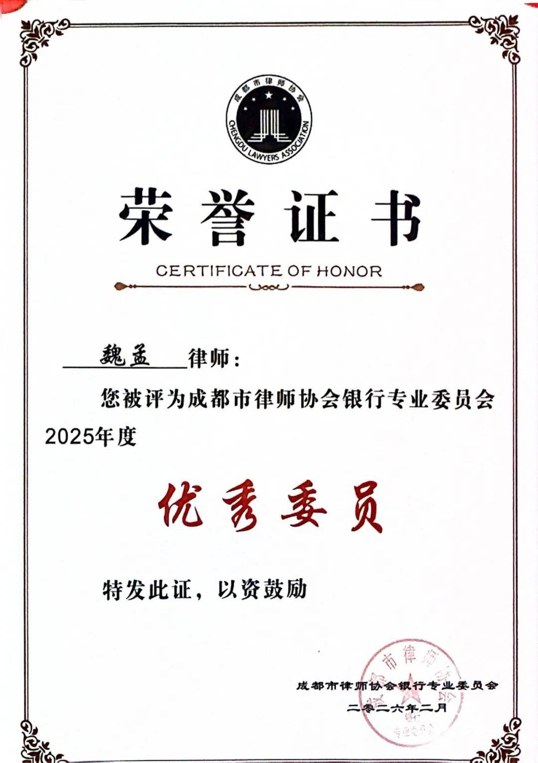 共工新闻网·GNN电(雷良)近日,成都市律师协会银行专业委员会公布2025年度评优结果,四川盛豪律师事务所合伙人魏孟律师凭借过硬的专业能力和突出的履职表现,荣获“2025年度优秀委员”称号。